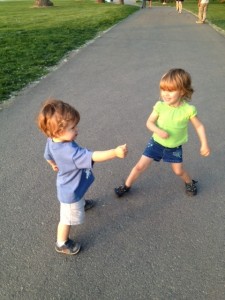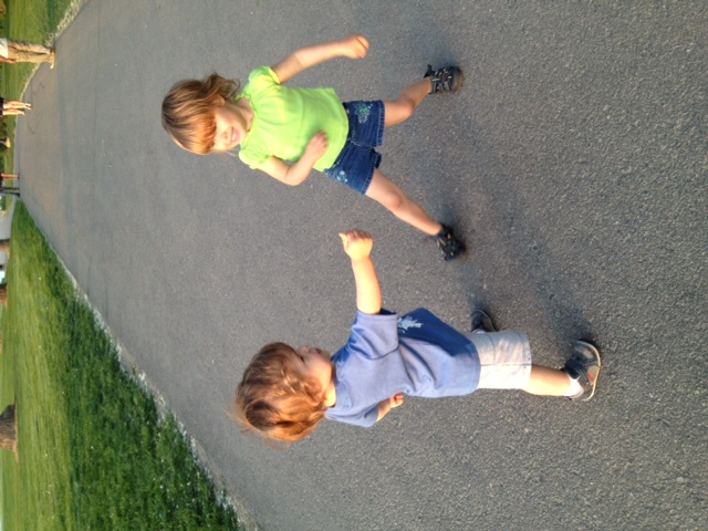 One night this week, we went walking around a lake in downtown Des Moines. It was a lovely and much needed break from the computer screen. Piper and Levi were acting like super hero’s and all along this bridge we crossed over, Piper would stop and yell very loudly “I’m Piper the Super Hero. I’m here to save the planet!” Where do they come up with these things? Too cute! here’s a picture of the two of them posing as “The Hero’s”.